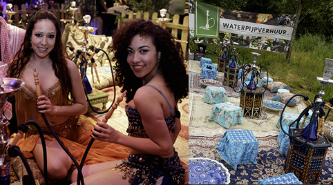Wij kunnen het waterpijpterras verzorgen in blauwe of aardse kleuren. Begeleider in het zwart of in Arabische kleding.