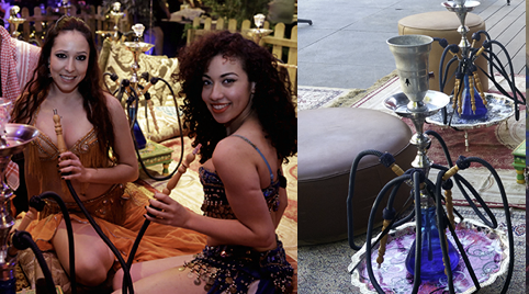 Wij kunnen het waterpijpterras verzorgen in blauwe of aardse kleuren. Begeleider in het zwart of in Arabische kleding.