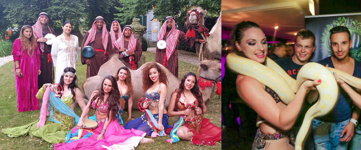 Wij zijn een dansgroep die gespecialiseerd is in themafeesten en partijen. Bij ons kunt u bestellen: danseressen, slangenbezweerder, slangen, kamelen, henna hoek met henna tatoeages, een waterpijpenterras, decoratie voor het gewenste thema, een fakir (mannelijke slangenbezweerder), meerdere buikdanseressen, schoenenpoetser, theeterras, livemuziek, waarzegster, dj, licht, etc.